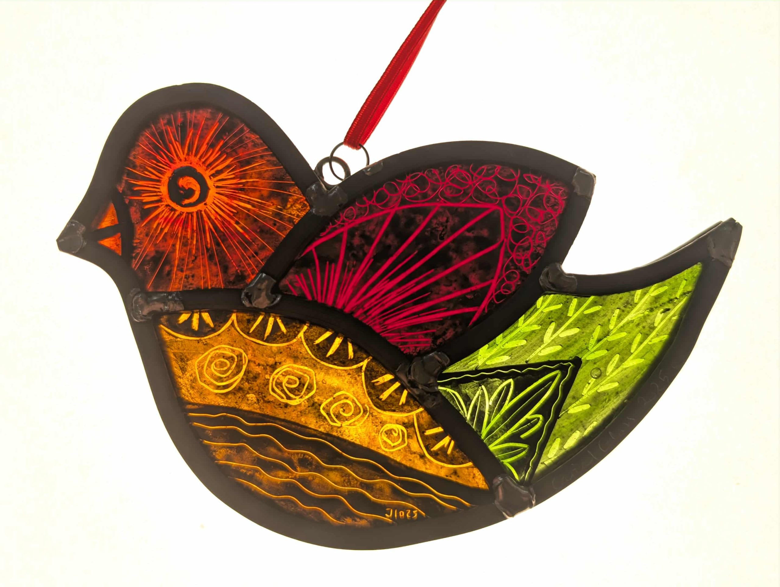Barbara the Baroque Birdie longs for the good life and simple times. We hand-cut each piece of glass, then Justine paints and kiln-fires it overnight. Chris leads, solders, and cements every panel with care. The result? A fabulously stained glass gift that’s full of fun and ready to brighten any space.