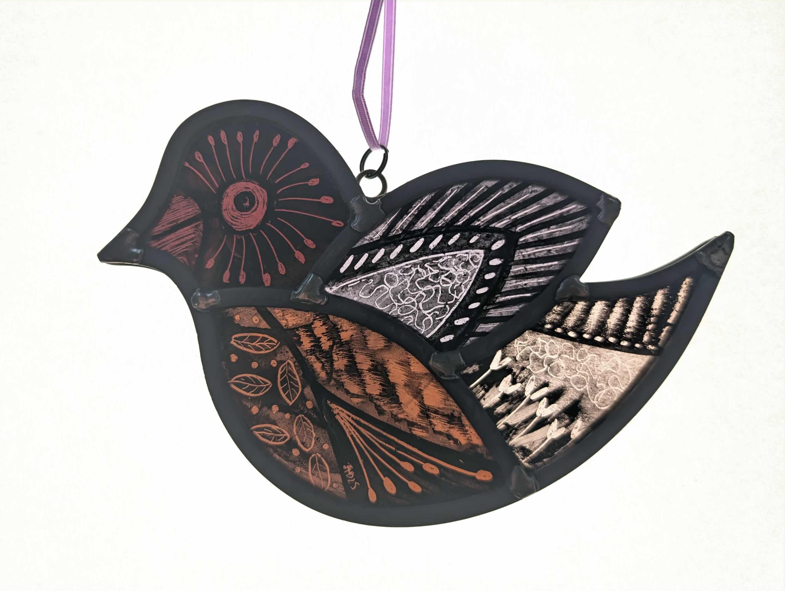 Beau the Baroque Birdie a purple bridie that loves fun and cake. We hand-cut each piece of glass, then Justine paints and kiln-fires it overnight. Chris leads, solders, and cements every panel with care. The result? A fabulously stained glass gift that’s full of fun and ready to brighten any space.