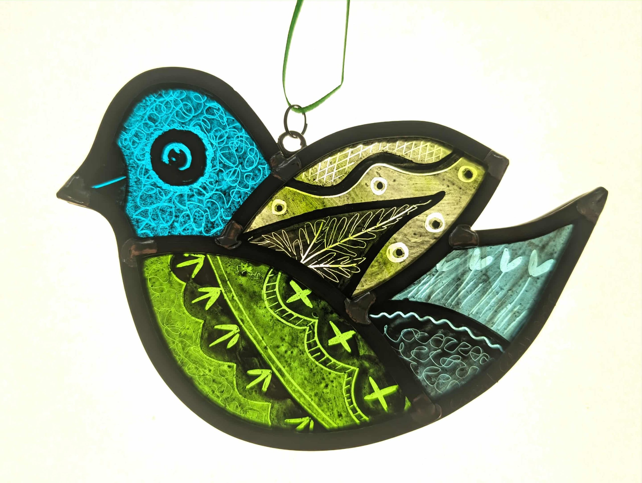 Blair the Baroque Birdie is named after the witch not the politician. Blair is ready to bring you good magic through colour and light. We hand-cut each piece of glass, then Justine paints and kiln-fires it overnight. Chris leads, solders, and cements every panel with care. The result? A fabulously stained glass gift that’s full of fun and ready to brighten any space.