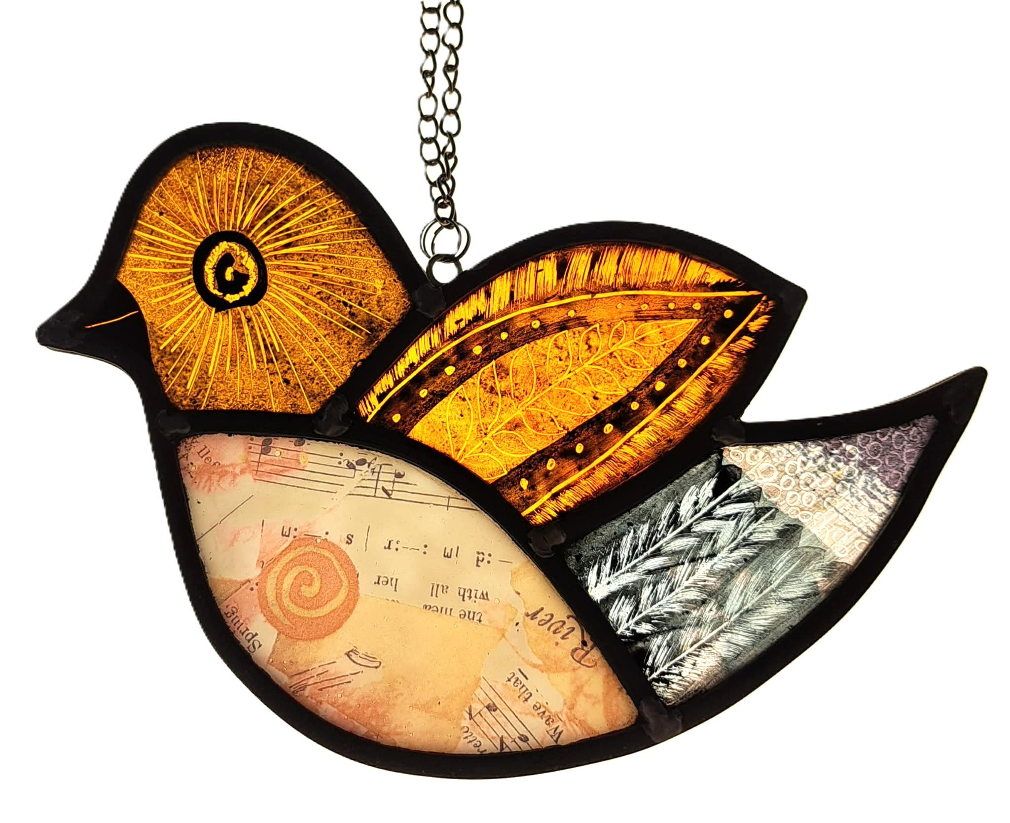 Beatrice the Baroque Birdie a slightly larger version of birdie, loves bright lights and a warm atmosphere. A real one off. We hand-cut each piece of glass, then Justine paints and kiln-fires it overnight. Chris leads, solders, and cements every panel with care. The result? A fabulously stained glass gift that’s full of fun and ready to brighten any space.