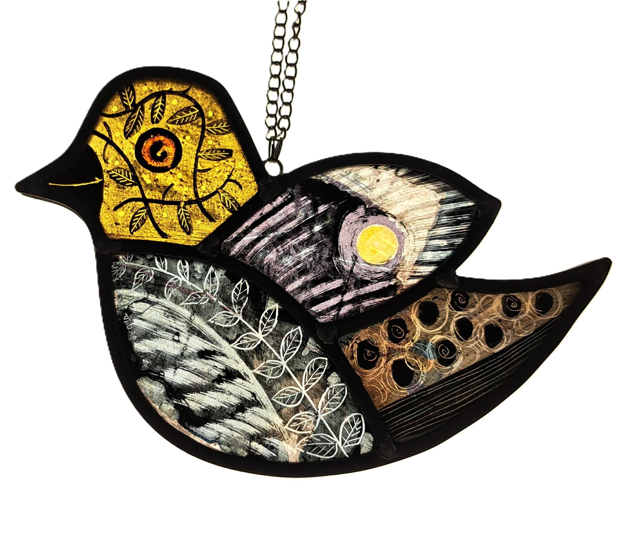 Becki the Baroque Birdie a slightly larger version of birdie, loves welsh cakes. A real one off. We hand-cut each piece of glass, then Justine paints and kiln-fires it overnight. Chris leads, solders, and cements every panel with care. The result? A fabulously stained glass gift that’s full of fun and ready to brighten any space.