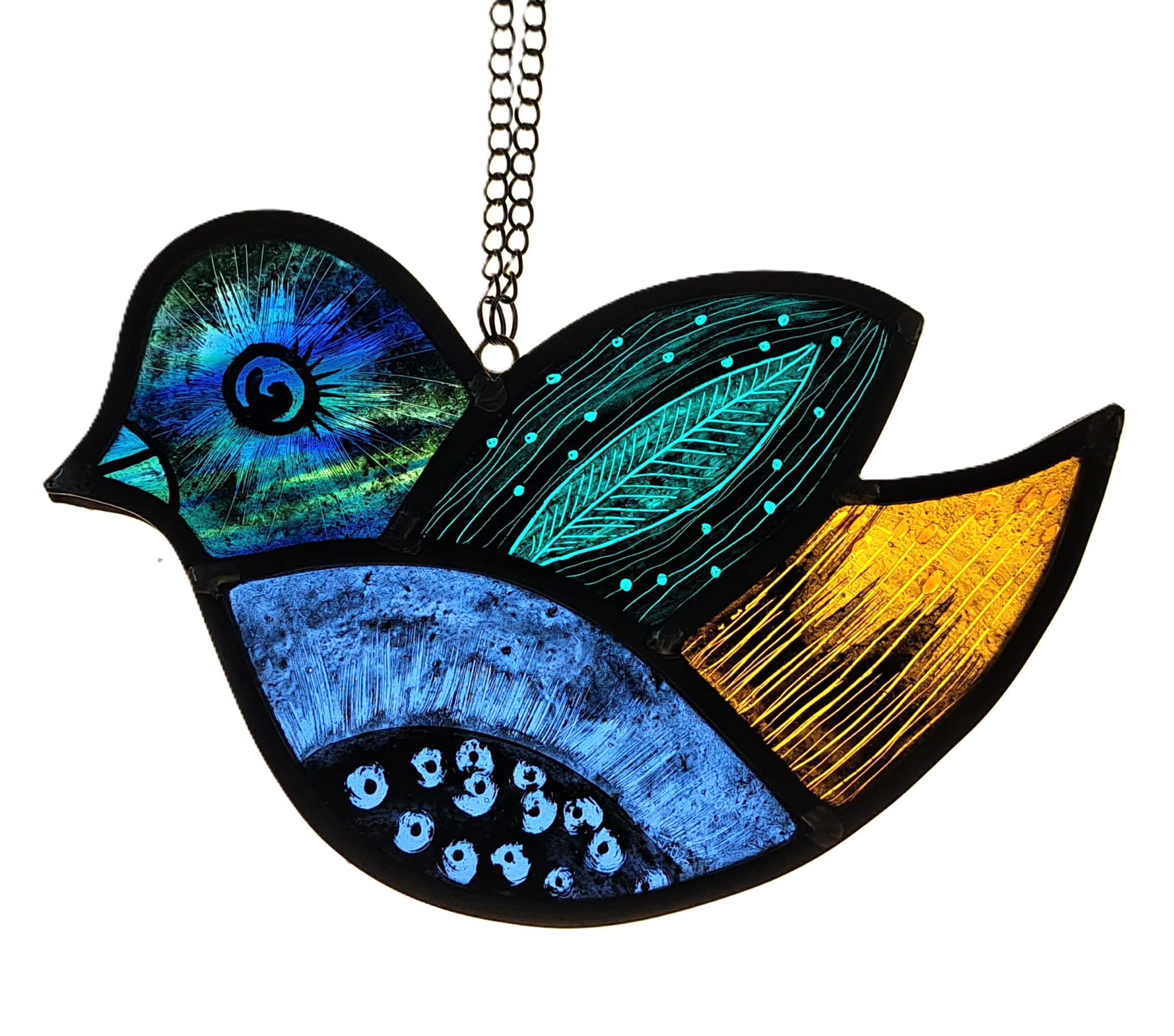 Billie the Baroque Birdie a slightly larger version of birdie, loves music and singing.  A real one off.  We hand-cut each piece of glass, then Justine paints and kiln-fires it overnight. Chris leads, solders, and cements every panel with care. The result? A fabulously stained glass gift that’s full of fun and ready to brighten any space.