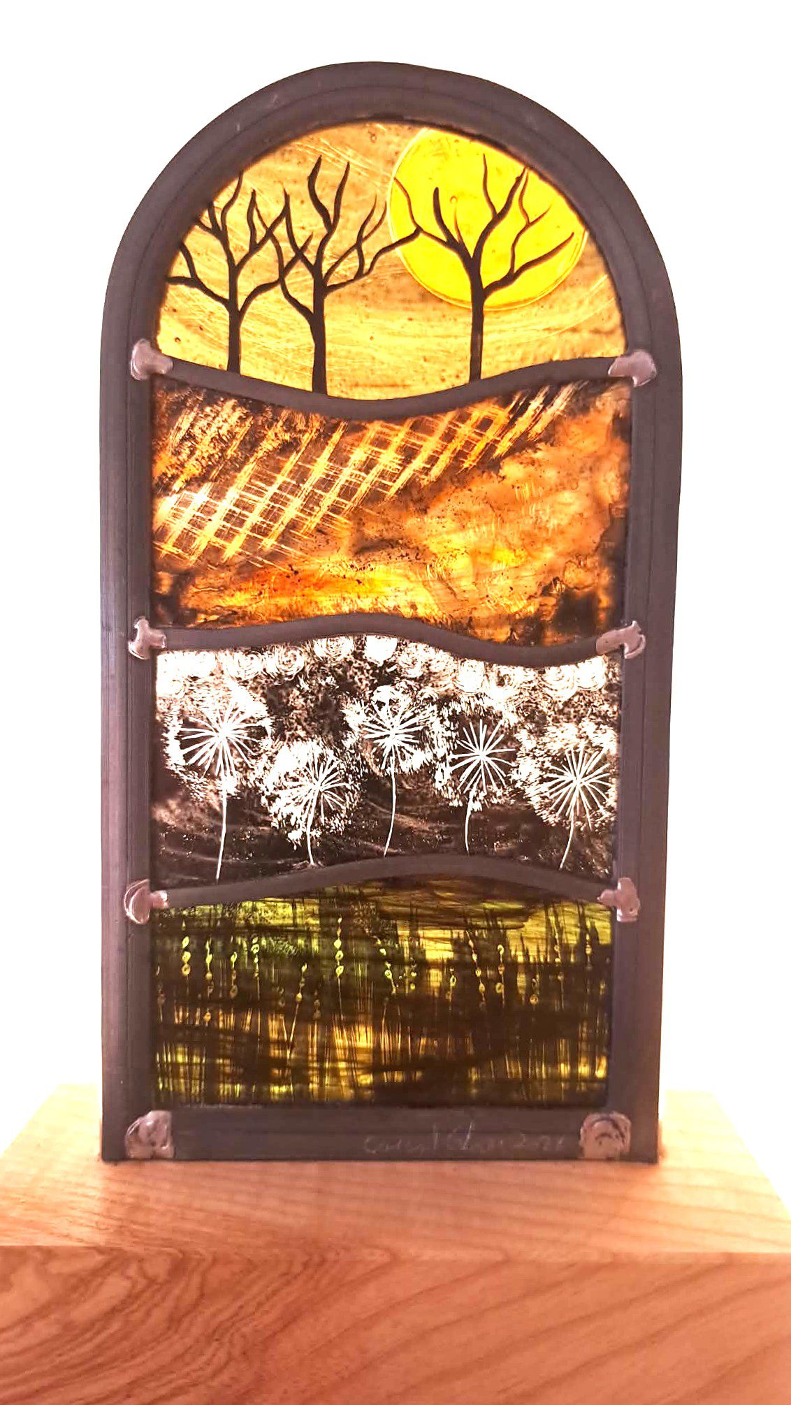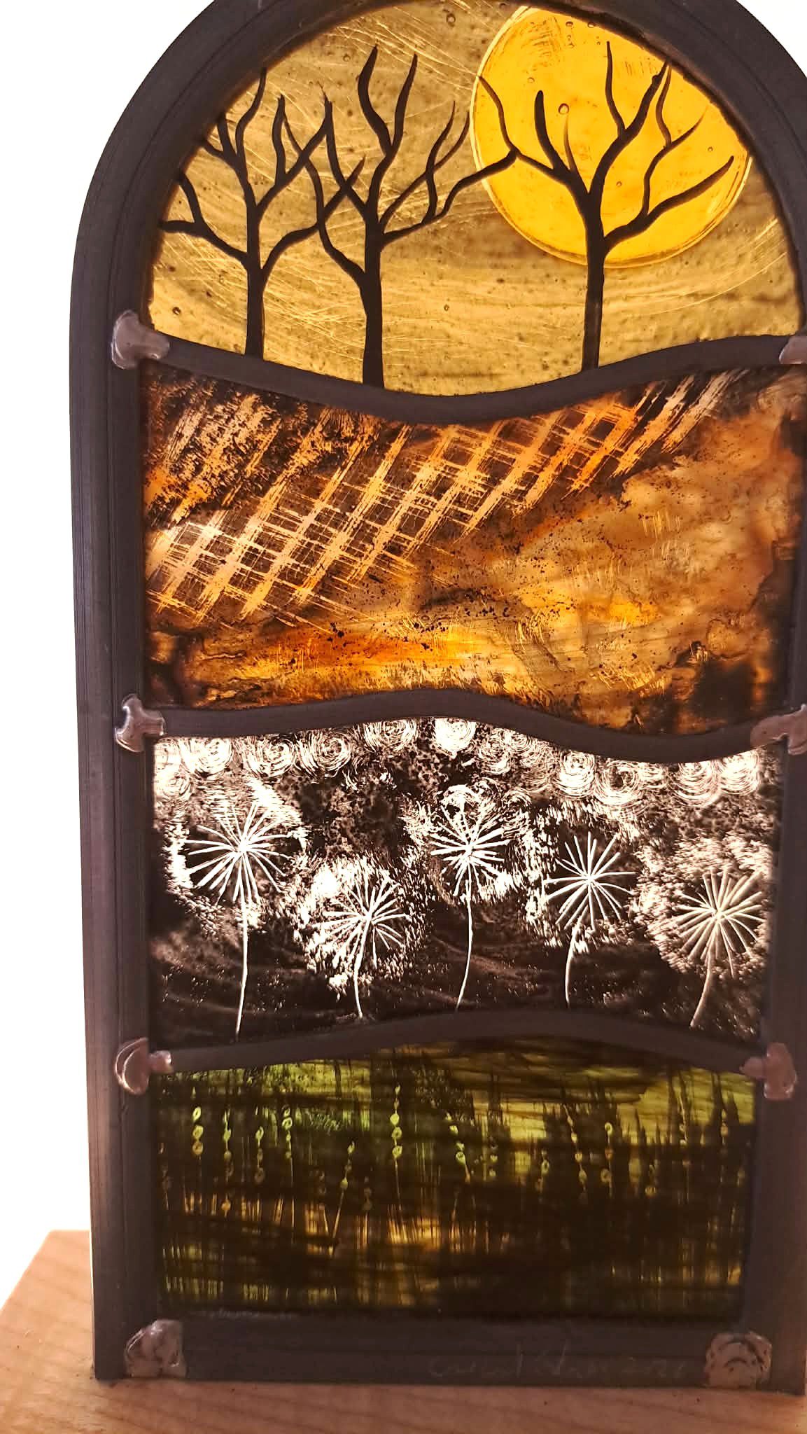 Chris then leads, solders, and mounts the stained glass artwork onto a solid timber plinth to ensure lasting quality.